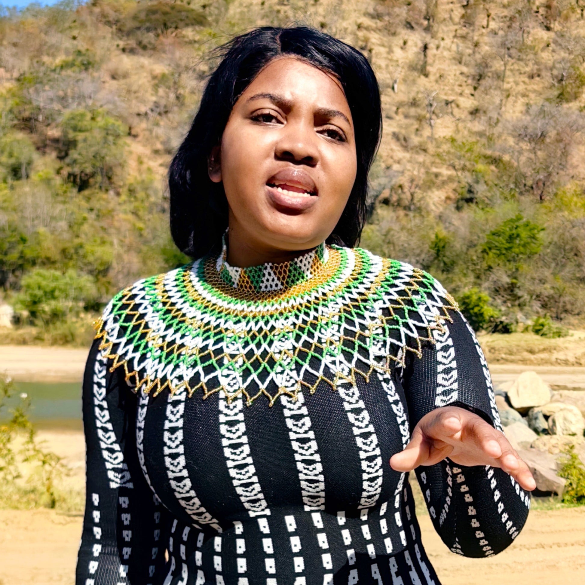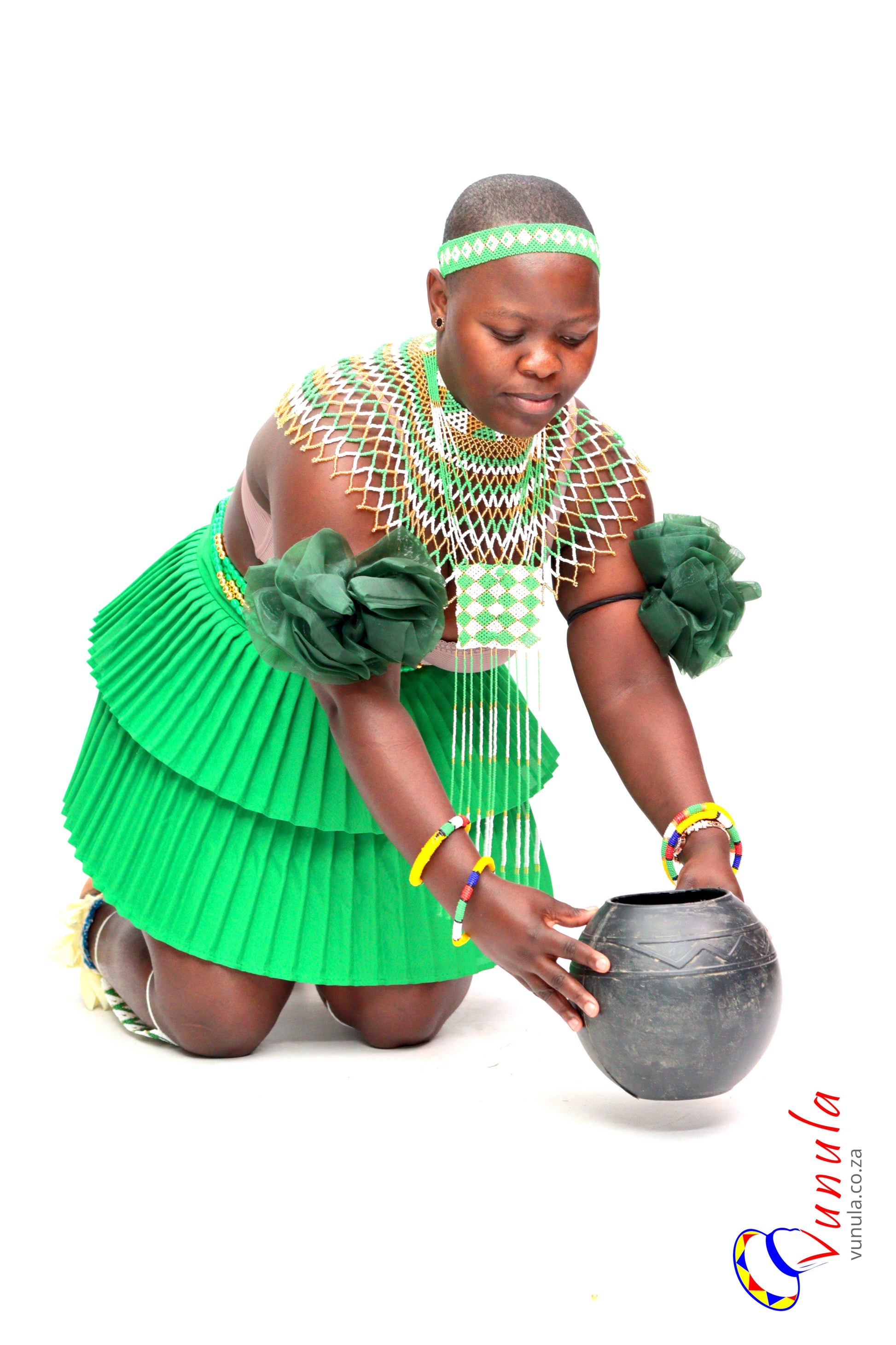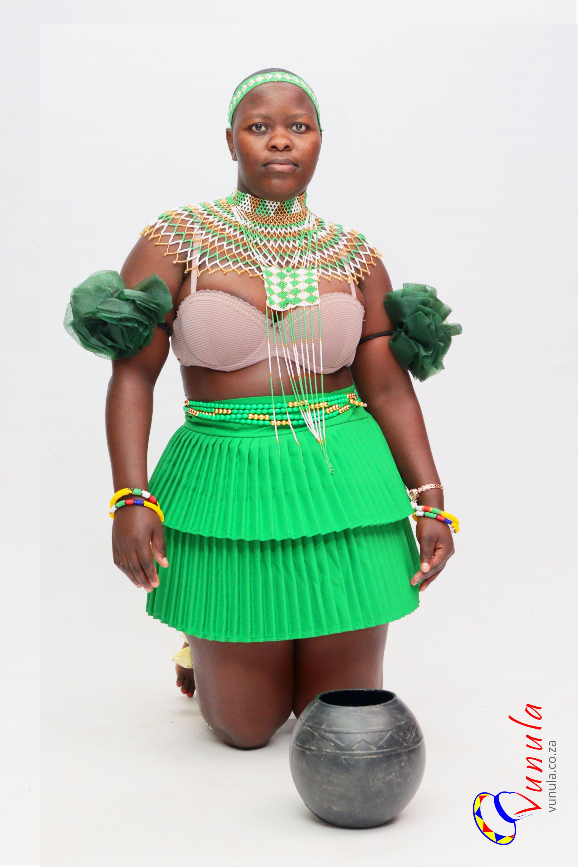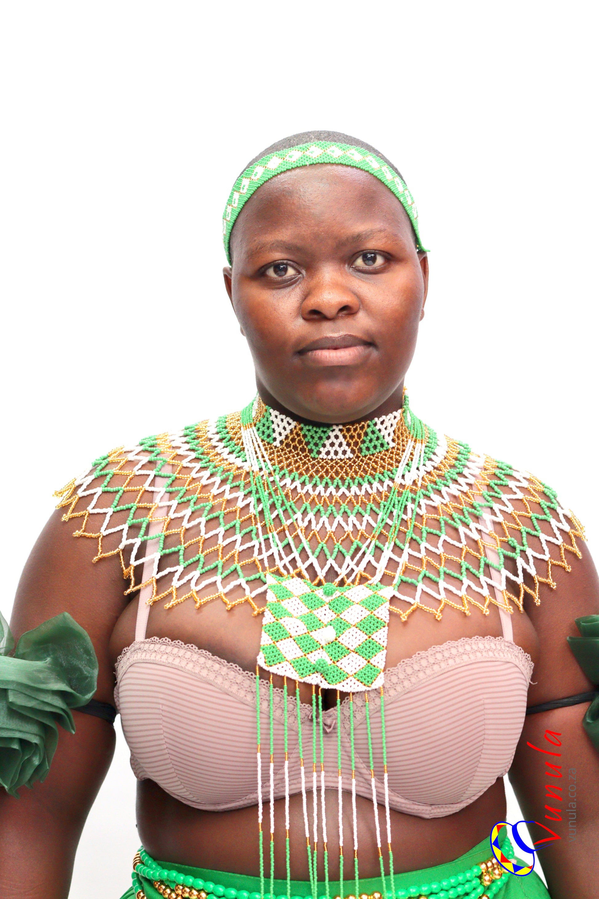 Zulu collar featuring intricate white, gold, and green beadwork. Traditionally worn with full Zulu attire, yet equally striking when styled with complementary modern outfits.